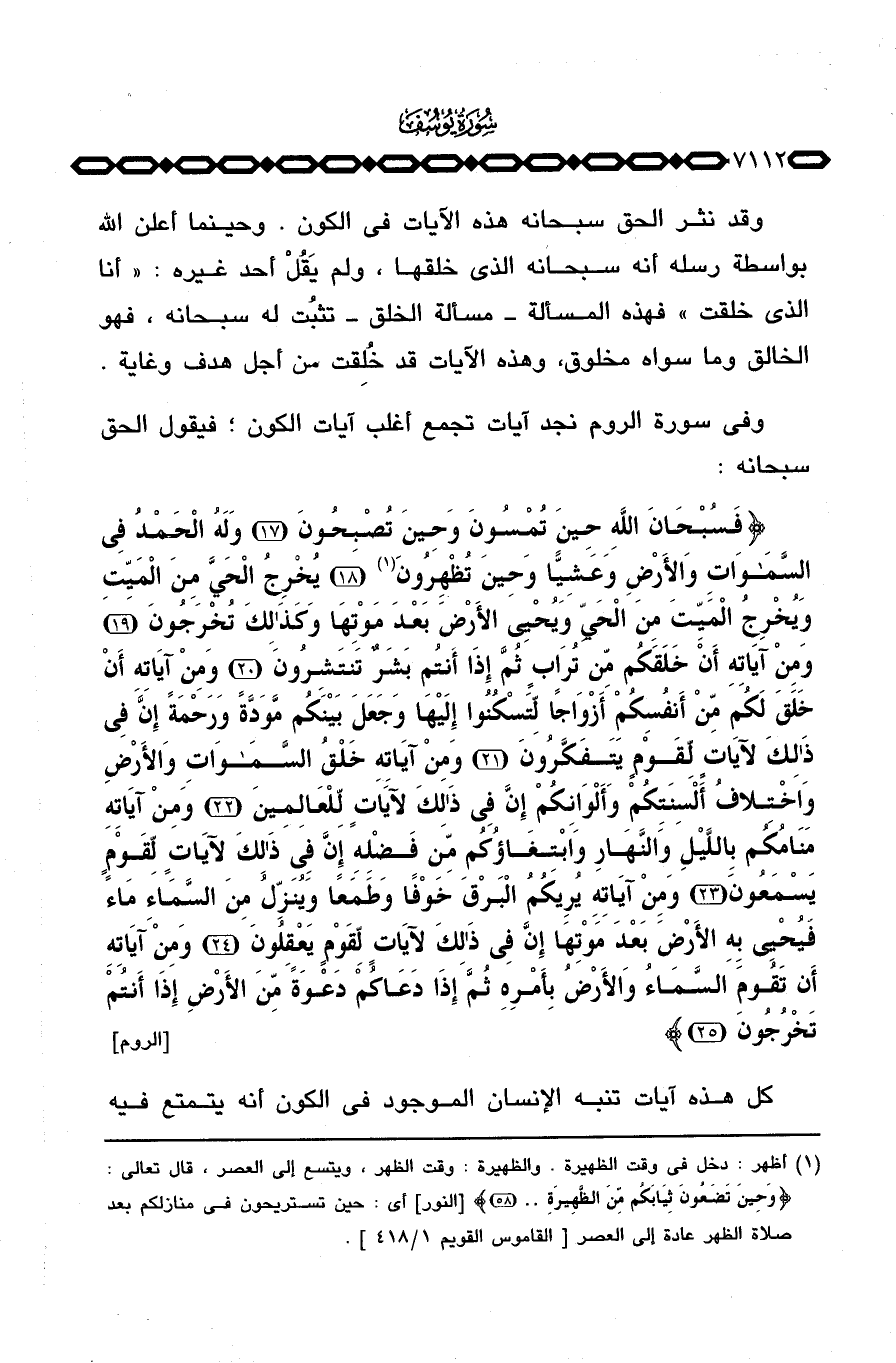 وفي سورة الروم نجد آيات تجمع أغلب آيات الكون؛ فيقول الحق سبحانه: {فَسُبْحَانَ الله حِينَ تُمْسُونَ وَحِينَ تُصْبِحُونَ وَلَهُ الحمد فِي السماوات والأرض وَعَشِيّاً وَحِينَ تُظْهِرُونَ يُخْرِجُ الحي مِنَ الميت وَيُخْرِجُ الميت مِنَ الحي وَيُحْي الأرض بَعْدَ مَوْتِهَا وَكَذَلِكَ تُخْرَجُونَ وَمِنْ آيَاتِهِ أَنْ خَلَقَكُمْ مِّن تُرَابٍ ثُمَّ إِذَآ أَنتُمْ بَشَرٌ تَنتَشِرُونَ وَمِنْ آيَاتِهِ أَنْ خَلَقَ لَكُم مِّنْ أَنفُسِكُمْ أَزْوَاجاً لتسكنوا إِلَيْهَا وَجَعَلَ بَيْنَكُم مَّوَدَّةً وَرَحْمَةً إِنَّ فِي ذَلِكَ لآيَاتٍ لِّقَوْمٍ يَتَفَكَّرُونَ وَمِنْ آيَاتِهِ خَلْقُ السماوات والأرض واختلاف أَلْسِنَتِكُمْ وَأَلْوَانِكُمْ إِنَّ فِي ذلك لآيَاتٍ لِّلْعَالَمِينَ وَمِنْ آيَاتِهِ مَنَامُكُم باليل والنهار وابتغآؤكم مِّن فَضْلِهِ إِنَّ فِي ذَلِكَ لآيَاتٍ لِّقَوْمٍ يَسْمَعُونَ وَمِنْ آيَاتِهِ يُرِيكُمُ البرق خَوْفاً وَطَمَعاً وَيُنَزِّلُ مِنَ السمآء مَآءً فَيُحْيِي بِهِ الأرض بَعْدَ مَوْتِهَا إِنَّ فِي ذَلِكَ لآيَاتٍ لِّقَوْمٍ يَعْقِلُونَ وَمِنْ آيَاتِهِ أَن تَقُومَ السمآء والأرض بِأَمْرِهِ ثُمَّ إِذَا دَعَاكُمْ دَعْوَةً مِّنَ الأرض إِذَآ أَنتُمْ تَخْرُجُونَ} [الروم: 17 - 25]