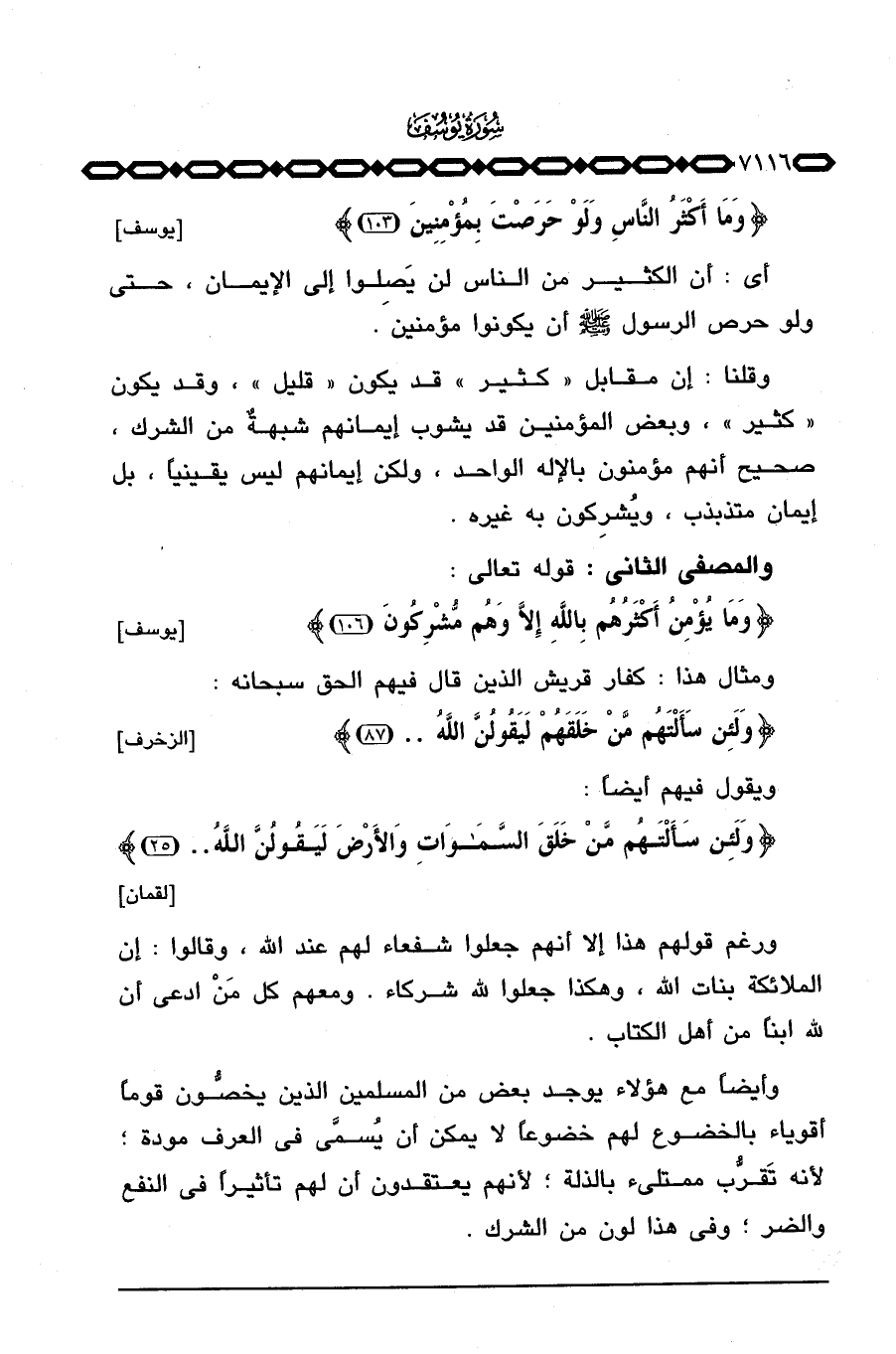 وقلنا: إن مقابل «كثير» قد يكون «قليل» ، وقد يكون «كثير» ، وبعض المؤمنين قد يشوب إيمانهم شبهةٌ من الشرك، صحيح أنهم مؤمنون بالإله الواحد، ولكن إيمانهم ليس يقينياً، بل إيمان متذبذب، ويُشرِكون به غيره.