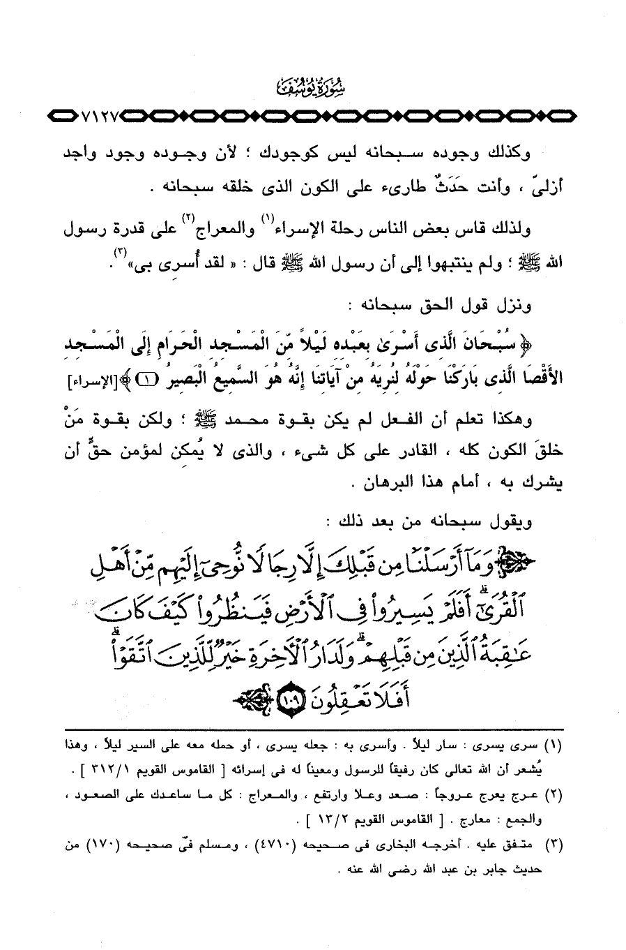 ونزل قول الحق سبحانه: {سُبْحَانَ الذي أسرى بِعَبْدِهِ لَيْلاً مِّنَ المسجد الحرام إلى المسجد الأقصى الذي بَارَكْنَا حَوْلَهُ لِنُرِيَهُ مِنْ آيَاتِنَآ إِنَّهُ هُوَ السميع البصير} [الإسراء: 1]