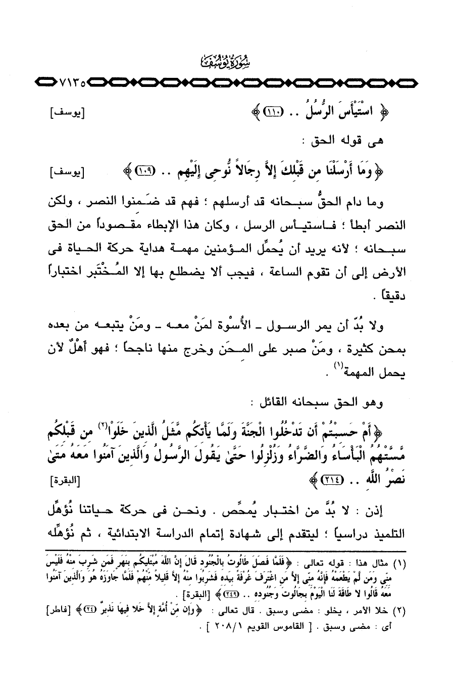 ومادام الحقُّ سبحانه قد أرسلهم؛ فهم قد ضَمِنوا النصر، ولكن النصر أبطأ؛ فاستيأس الرسل، وكان هذا الإبطاء مقصوداً من الحق سبحانه؛ لأنه يريد أن يُحمِّل المؤمنين مهمة هداية حركة الحياة في الأرض إلى أن تقوم الساعة، فيجب ألا يضطلع بها إلا المُخْتَبر اختباراً دقيقاً.