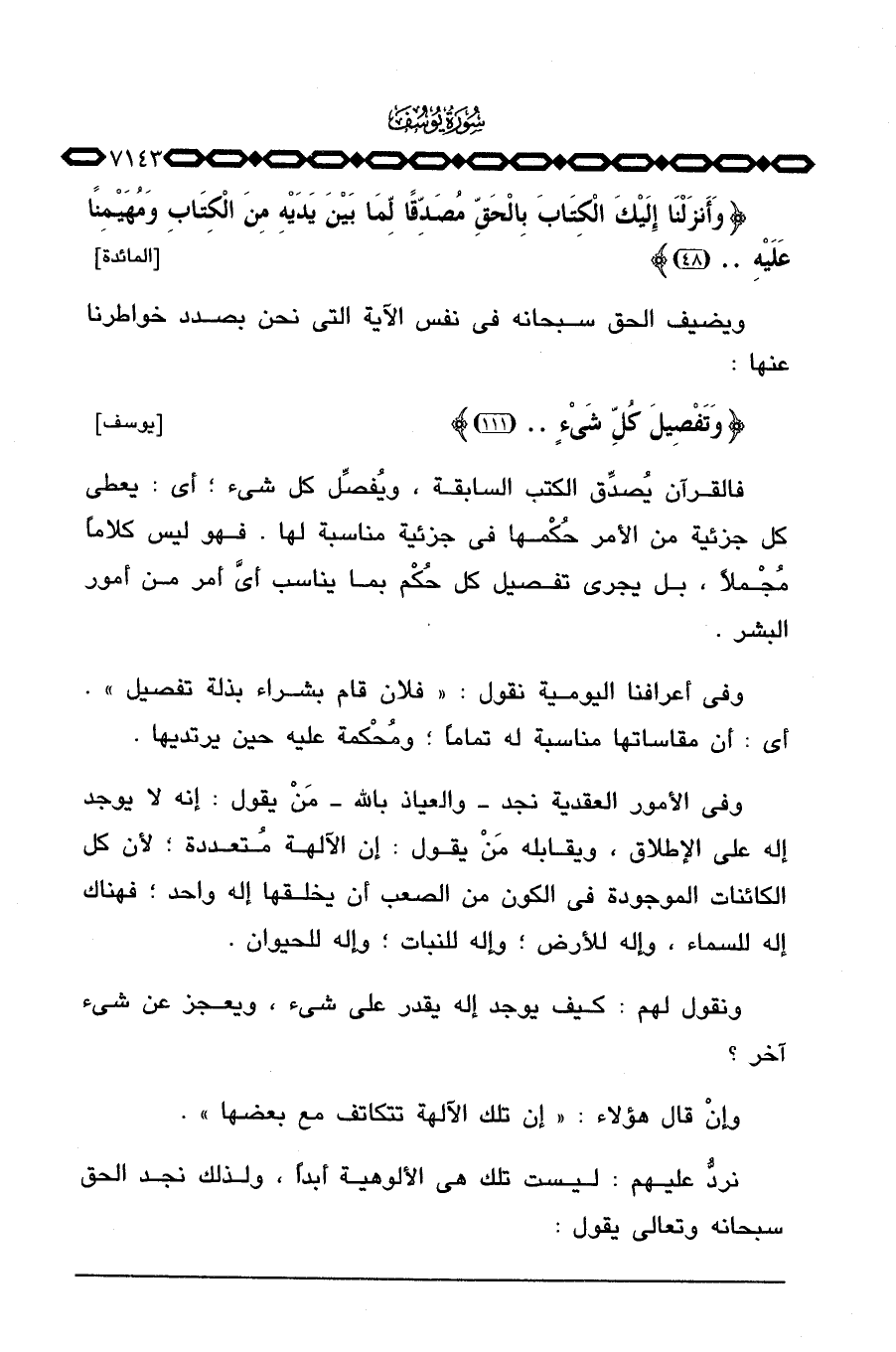 فالقرآن يُصدِّق الكتب السابقة، ويُفصِّل كل شيء؛ أي: يعطي كل جزئية من الأمر حُكْمها في جزئية مناسبة لها. فهو ليس كلاماً مُجْملاً، بل يجري تفصيل كل حُكْم بما يناسب أيَّ أمر من أمور البشر.