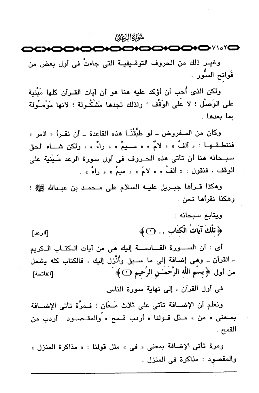 وكان من المفروض لو طبَّقْنَا هذه القاعدة أن نقرأ «المر» فننطقها: «ألفٌ» «لامٌ» «ميمٌ» «راءٌ» ، ولكن شاء الحق سبحانه هنا أن تأتي هذه الحروف في أول سورة الرعد مَبْنية على الوقف، فنقول: «ألفْ» «لامْ» «ميمْ» «راءْ» .