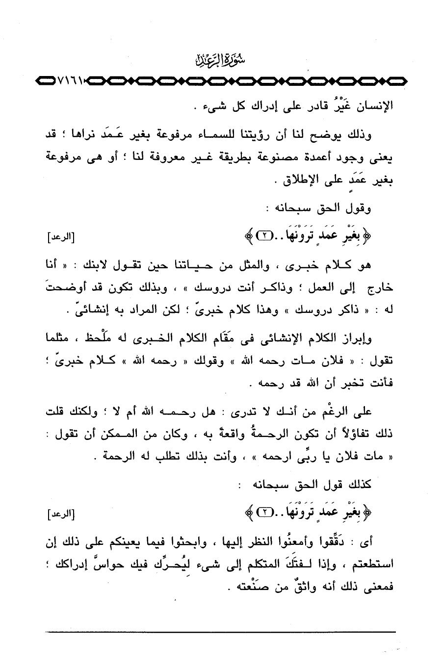 وذلك يوضح لنا أن رؤيتنا للسماء مرفوعة بغير عَمَد نراها؛ قد يعني وجود أعمدة مصنوعة بطريقة غير معروفة لنا؛ أو هي مرفوعة بغير عَمَدٍ على الإطلاق.
