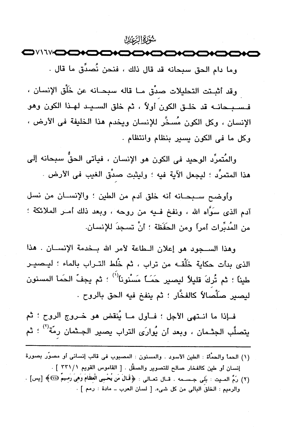 وهذا السجود هو إعلان الطاعة لأمر الله بخدمة الإنسان. هذا الذي بدأت حكاية خَلْقه من تراب، ثم خُلط التراب بالماء؛ ليصير طيناً؛ ثم تُرِكَ قليلاً ليصير حَمَأً مَسْنوناً؛ ثم يجفّ الحَمأ ليصير صَلْصالاً كالفخَّار؛ ثم ينفخ فيه الحق بالروح.