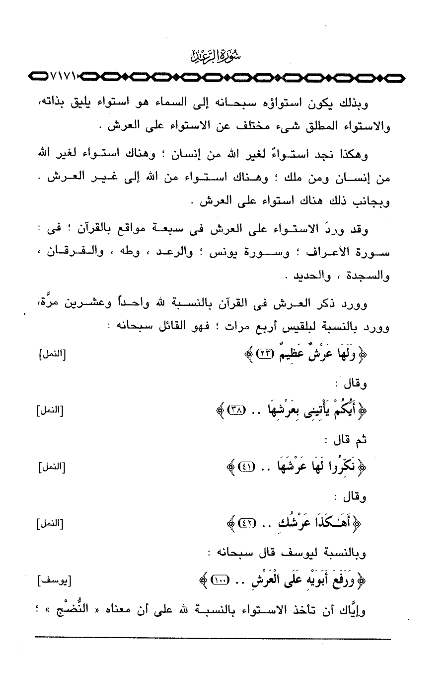 وقد وردَ الاستواء على العرش في سبعة مواقع بالقرآن؛ في: سورة الأعراف؛ وسورة يوسف؛ والرعد، وطه، والفرقان، والسجدة، والحديد.