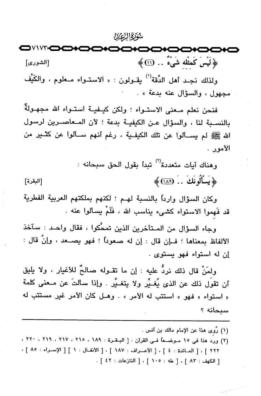 ولِمَنْ قال ذلك نردُّ عليه: إن ما تقوله صالحٌ للأغيار، ولا يليق أن تقول ذلك عن الذي يُغيِّر ولا يتغيَّر. وإذا سألتَ عن معنى كلمة» استواء «فهو» استتب له الأمر «. وهل كان الأمر غير مستتب له سبحانه؟
