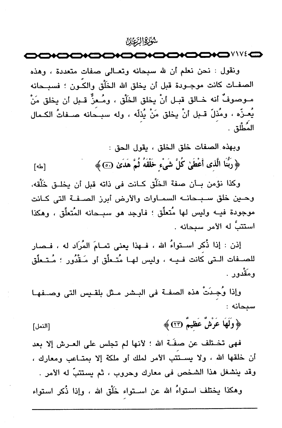 فهي تختلف عن صِفَة الله؛ لأنها لم تجلس على العرش إلا بعد أن خلقها الله، ولا يستتب الأمر لملك أو ملكة إلا بمتاعب ومعارك، وقد ينشغل هذا الشخص في معارك وحروب، ثم يستتبّ له الأمر.
