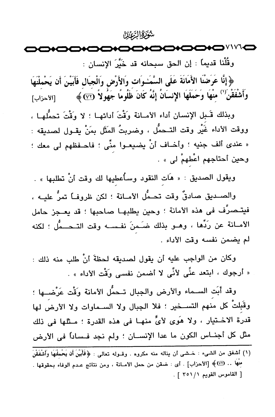 وبذلك قَبِل الإنسان أداء الأمانة وَقْتَ أدائها؛ لا وَقْتَ تحمُّلها، ووقت الأداء غير وقت التحمُّل، وضربتُ المَثَل بمَنْ يقول لصديقه «عندي ألف جنيه؛ وأخاف أنْ يضيعوا مِنِّي؛ فاحفظهم لي معك؛ وحين أحتاجهم اعْطِهمْ لي» .