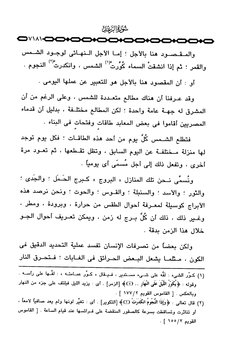 ونُسمِّي نحن تلك المنازل» البروج «كبرج الحَمَل؛ والجَدي؛ والثور؛ والأسد؛ والسنبلة؛ والقوس؛ والحوت؛ ونحن نرصد هذه الأبراج كوسيلة لمعرفة أحوال الطقس من حرارة، وبرودة، ومطر، وغير ذلك، ذلك أن كُلَّ برج له زمن، ويمكن تعريف أحوال الجو خلال هذا الزمن بدقة.