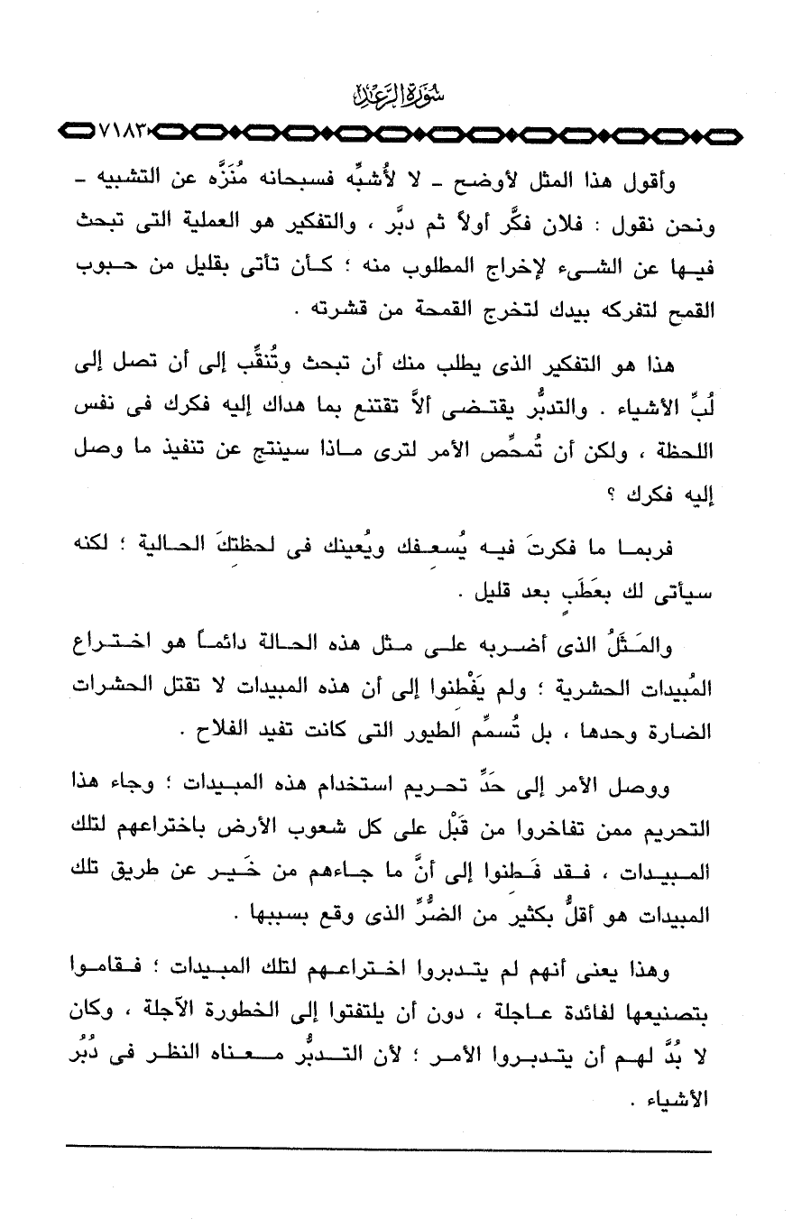 وأقول هذا المثل لأوضح لا لأُشبِّه فسبحانه مُنَزَّه عن التشبيه ونحن نقول: فلان فكَّر أولاً ثم دبَّر، والتفكير هو العملية التي تبحث فيها عن الشيء لإخراج المطلوب منه؛ كأن تأتي بقليل من حبوب القمح لتفركه بيدك لتخرج القمحة من قشرته.