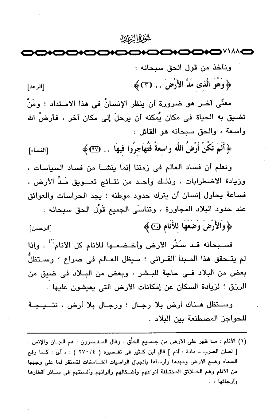 فسبحانه قد سَخَّر الأرض وأخضعها للأنام كل الأنام، وإذا لم يتحقق هذا المبدأ القرآني؛ سيظل العالم في صراع؛ وستظلُّ بعض من البلاد في حاجة للبشر وبعض من البلاد في ضِيق من الرزق؛ لزيادة السكان عن إمكانات الأرض التي يعيشون عليها.