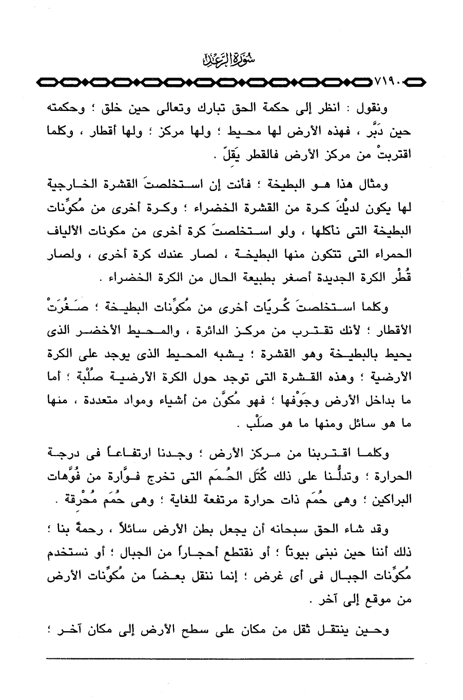ونقول: انظر إلى حكمة الحق تبارك وتعالى حين خلق؛ وحكمته حين دَبَّر، فهذه الأرض لها محيط؛ ولها مركز؛ ولها أقطار، وكلما اقتربتْ من مركز الأرض فالقطر يَقِلّ.
