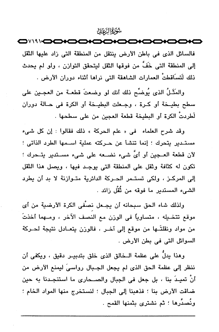 وقد شرح العلماء في «علم الحركة» ذلك فقالوا: إن كل شيء مستدير يتحرك؛ إنما تنشأ عن حركته عملية اسمها الطرد الذاتي؛ لأن قطعة العجين أو أيَّ شيء نضعه على شيء مستدير يتحرك تكون له كثافة وثقل على المنطقة التي يوجد فيها، ويصل هذا الثقل إلى المركز، ولكي تستمر الحركة الدائرية متوازنة لابد أن يطرد الشيء المستدير ما فوقه من ثُقْل زائد.