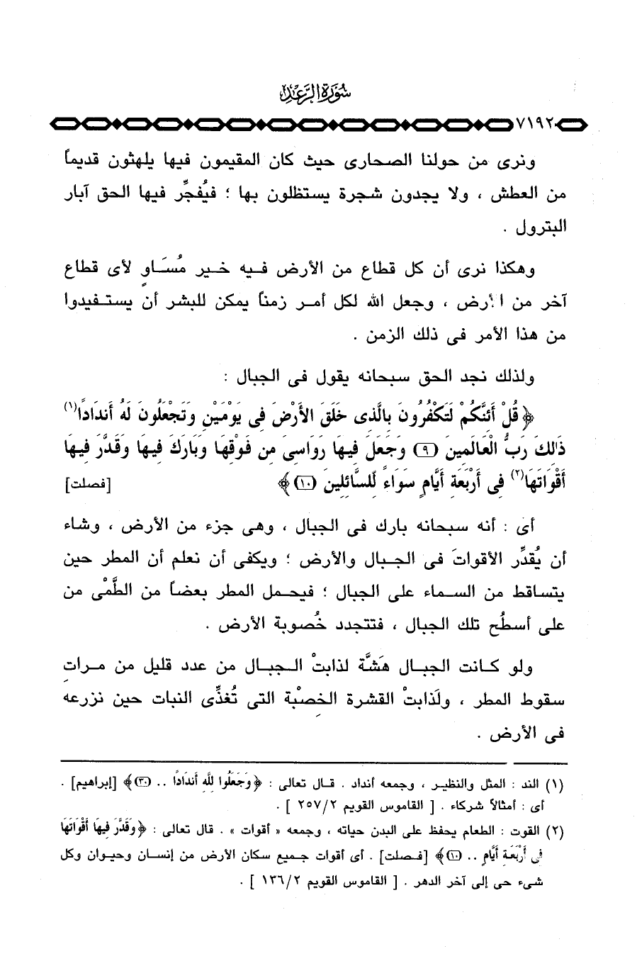 أي: أنه سبحانه بارك في الجبال،، وهي جزء من الأرض، وشاء أن يُقدِّر الأقواتَ في الجبال والأرض؛ ويكفي أن نعلم أن المطر حين يتساقط من السماء على الجبال؛ فيحمل المطر بعضاً من الطَّمْي من على أسطُح تلك الجبال، فتتجدد خُصوبة الأرض.