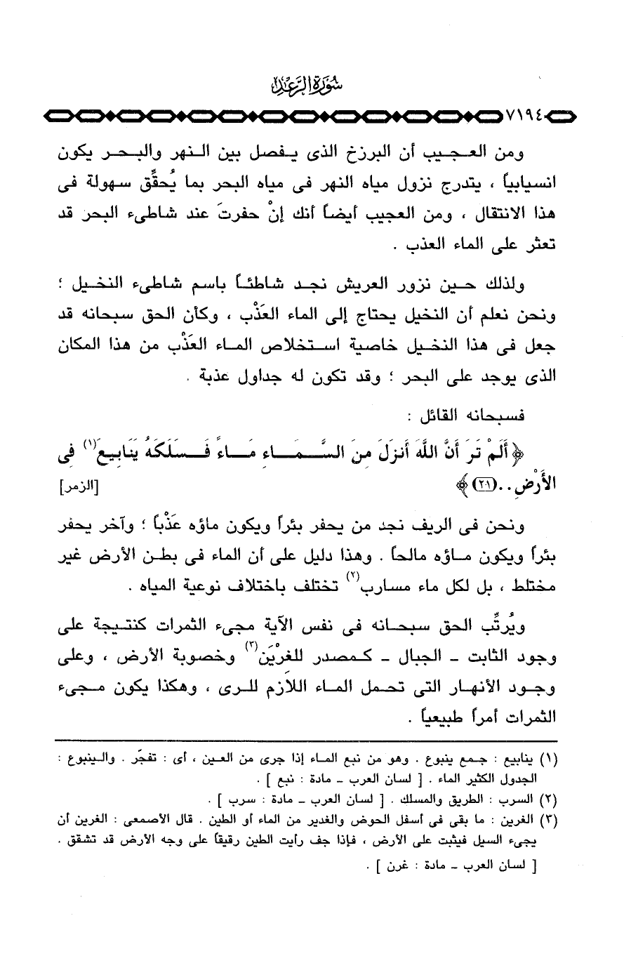 ونحن في الريف نجد من يحفر بئراً ويكون ماؤه عَذْباً؛ وآخر يحفر بئراً ويكون ماؤه مالحاً. وهذا دليل على أن الماء في بطن الأرض غير مختلط، بل لكل ماء مسارب تختلف باختلاف نوعية المياه.