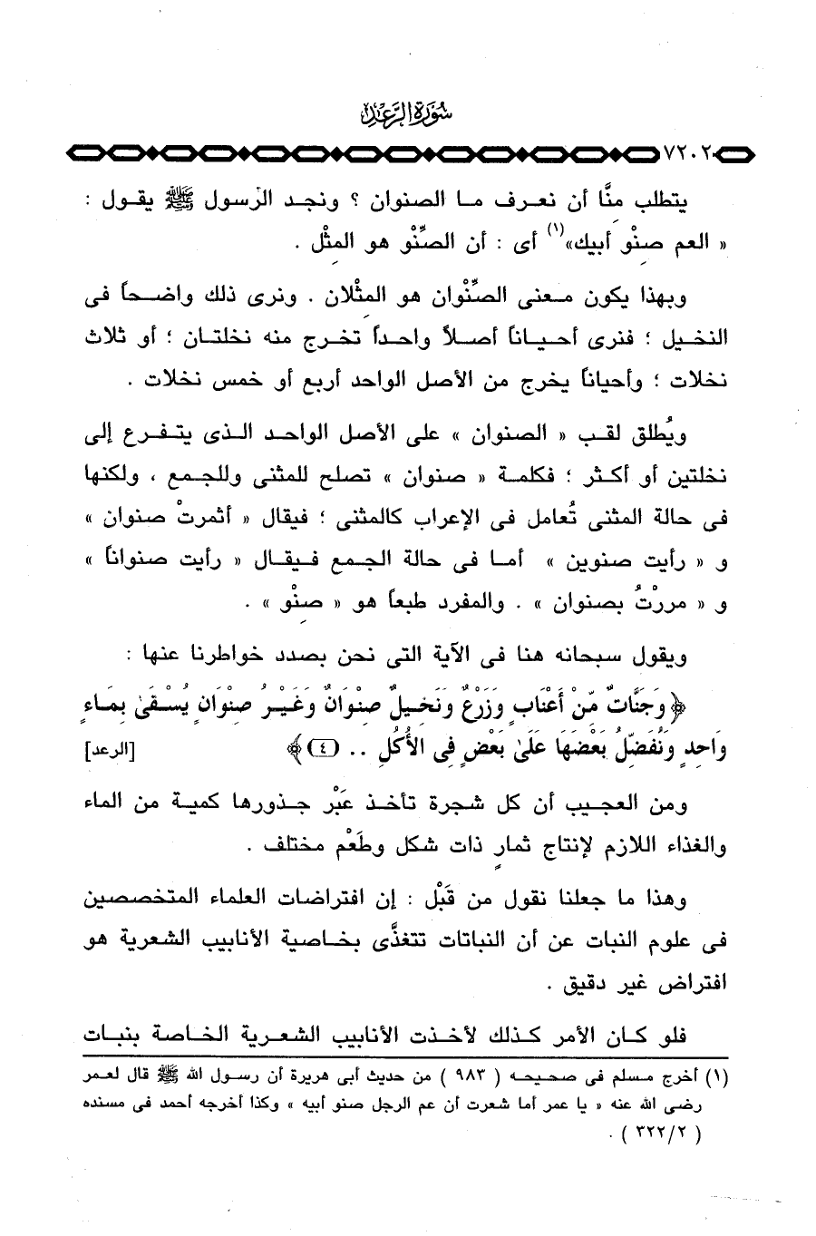 وبهذا يكون معنى الصِّنْوان هو المِثْلان. ونرى ذلك واضحاً في النخيل؛ فنرى أحياناً أصلاً واحداً تخرج منه نخلتان؛ أو ثلاث نخلات؛ وأحياناً يخرج من الأصل الواحد أربع أو خمس نخلات.