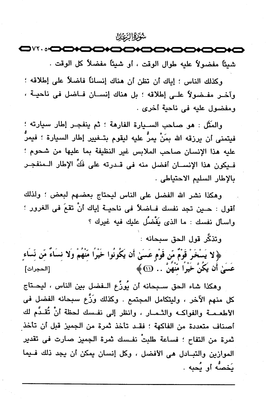 وهكذا نشر الله الفضل على الناس ليحتاج بعضهم لبعض؛ ولذلك أقول: حين تجد نفسك فاضلاً في ناحية إياك أنْ تقعَ في الغرور؛ واسأل نفسك: ما الذي يَفْضُل عليك فيه غيرك؟