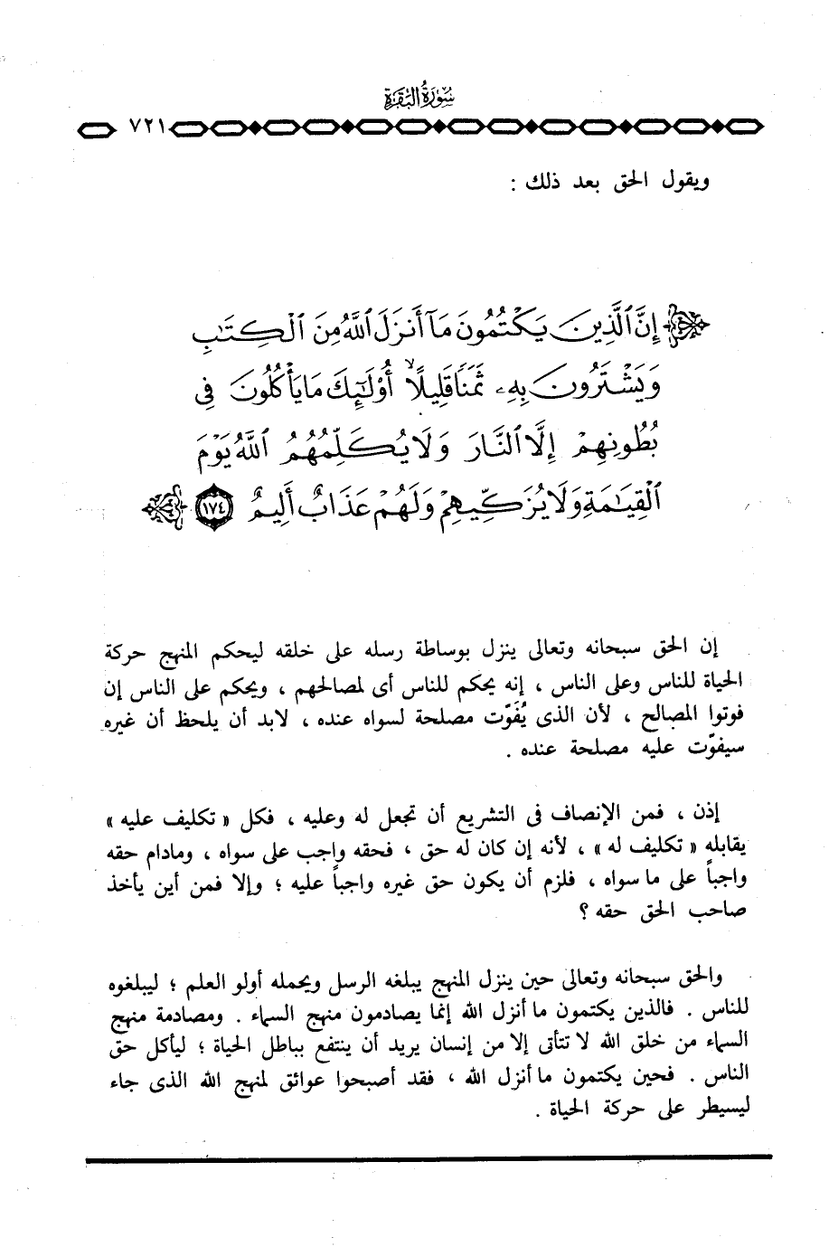والحق سبحانه وتعالى حين ينزل المنهج يبلغه الرسل ويحمله أولو العلم؛ ليبلغوه للناس، فالذين يكتمون ما أنزل الله إنما يصادمون منهج السماء. ومصادمة منهج السماء من خلق الله لا تتأتى إلا من إنسان يريد أن ينتفع بباطل الحياة؛ ليأكل حق الناس. فحين يكتمون ما أنزل الله، فقد أصبحوا عوائق لمنهج الله الذي جاء ليسيطر على حركة الحياة.