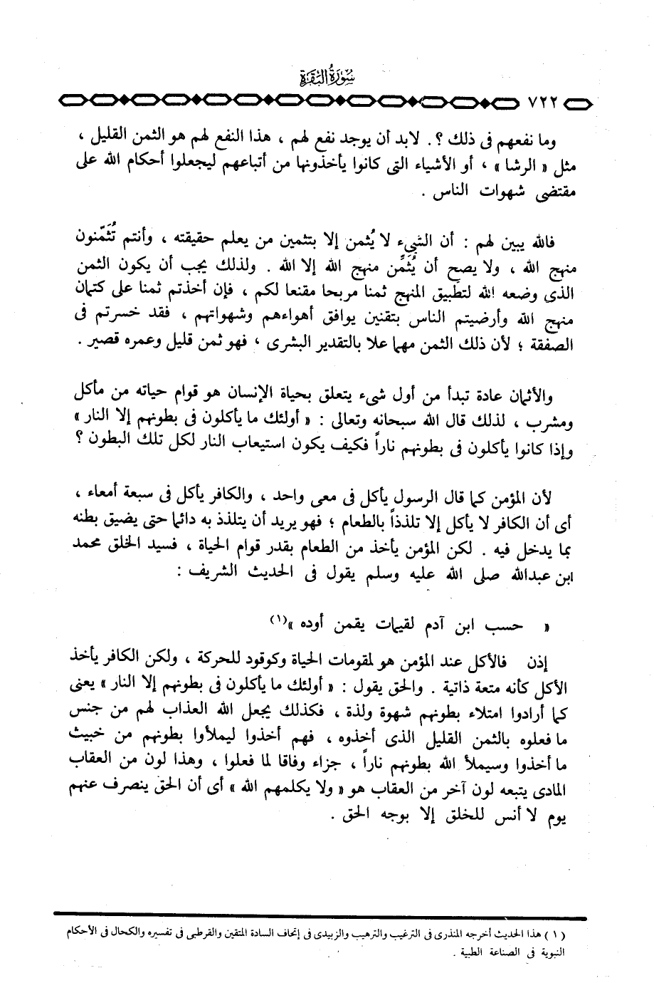 لأن المؤمن كما قال الرسول يأكل في معي واحد، والكافر يأكل في سبعة أمعاء، أي أن الكافر لا يأكل إلا تلذذاً بالطعام؛ فهو يريد أن يتلذذ به دائما حتى يضيق بطنه بما يدخل فيه. لكن المؤمن يأخذ من الطعام بقدر قوام الحياة، فسيد الخلق محمد بن عبد الله صَلَّى اللَّهُ عَلَيْهِ وَسَلَّم َ يقول في الحديث الشريف: «حسب ابن آدم لقيمات يقمن أوده» .