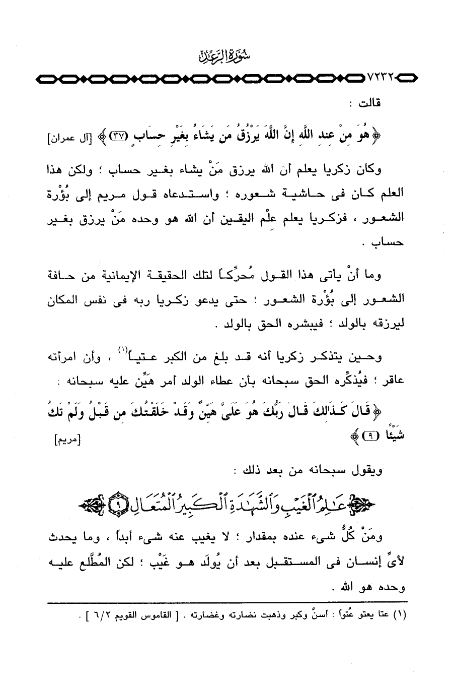 وكان زكريا يعلم أن الله يرزق مَنْ يشاء بغير حساب؛ ولكن هذا العلم كان في حاشية شعوره؛ واستدعاه قول مريم إلى بُؤْرة الشعور، فزكريا يعلم عِلْم اليقين أن الله هو وحده مَنْ يرزق بغير حساب.