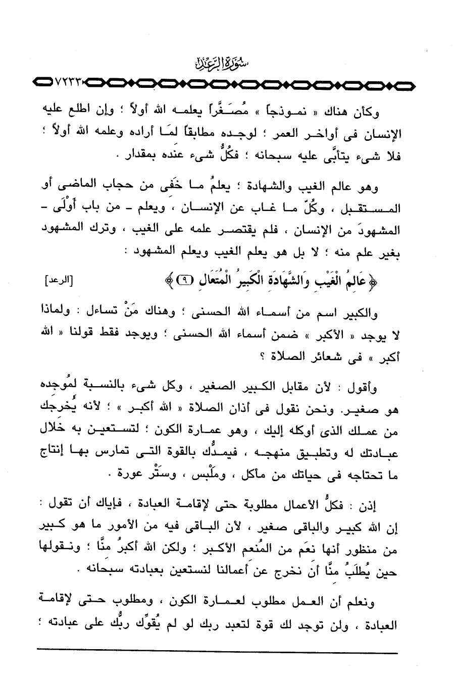 وأقول: لأن مقابل الكبير الصغير، وكل شيء بالنسبة لمُوجِده هو صغير. ونحن نقول في أذان الصلاة «الله اكبر» ؛ لأنه يُخرِجك من عملك الذي أوكله إليك، وهو عمارة الكون؛ لتستعين به خلال عبادتك له وتطبيق منهجه، فيمدُّك بالقوة التي تمارس بها إنتاج ما تحتاجه في حياتك من مأكل، ومَلْبس، وسَتْر عورة.