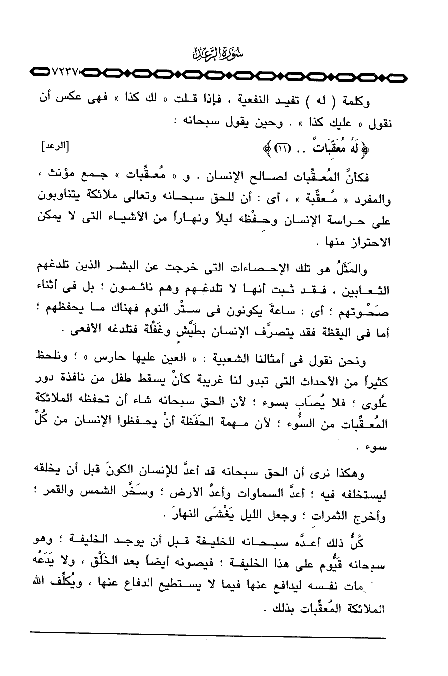 فكأنَّ المُعقِّبات لصالح الإنسان. و «مُعقِّبات» جمع مؤنث، والمفرد «مُعقِّبة» ، أي: أن للحق سبحانه وتعالى ملائكة يتناوبون على حراسة الإنسان وحِفْظه ليلاً ونهاراً من الأشياء التي لا يمكن الاحتراز منها.