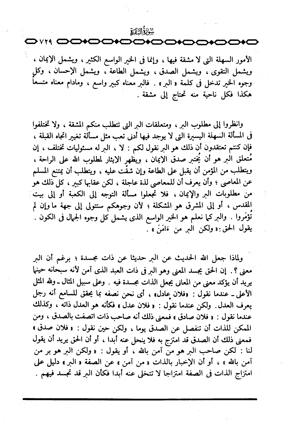الأمور السهلة التي لا مشقة فيها، وإنما في الخير الواسع الكثير، ويشمل الإيمان ويشمل التقوى، ويشمل الصدق، ويشمل الطاعة، ويشمل الإحسان، وكل وجوه الخير تدخل في كلمة «البر» . فالبر معناه كبير واسع، ومادام معناه متسعا هكذا فكل ناحية منه تحتاج إلى مشقة.