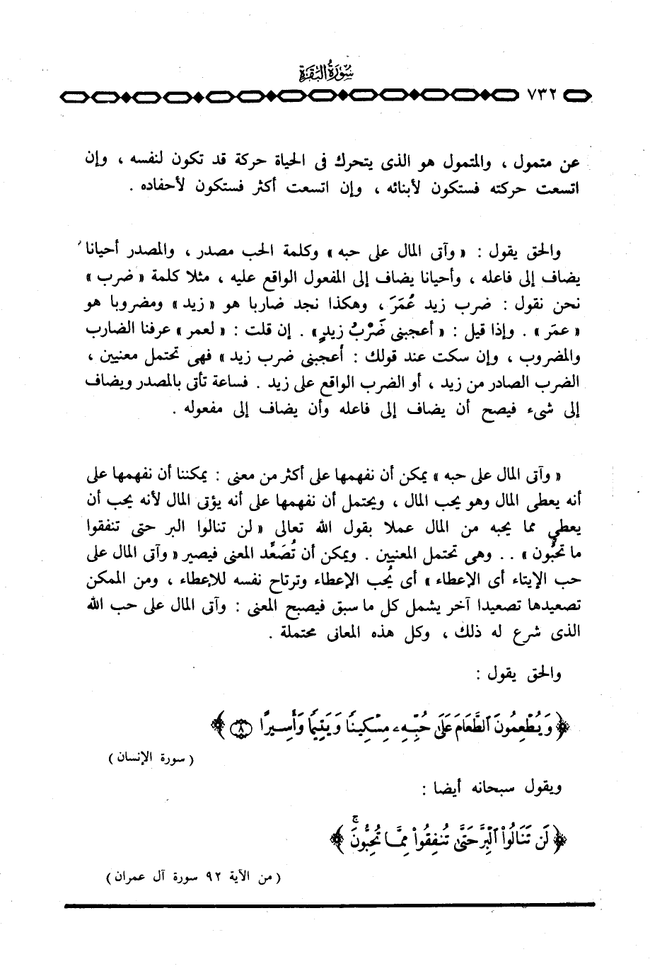 {وَآتَى المال على حُبِّهِ} يمكن أن نفهمه على أكثر من معنى: يمكننا أن نفهمها على أنه يعطي المال وهو يحب المال، ويحتمل أن نفهمها على أنه يؤتي المال لأنه يحب أن يعطي مما يحبه من المال عملا بقول الله تعالى {لَن تَنَالُواْ البر حتى تُنْفِقُواْ مِمَّا تُحِبُّونَ} . . وهي تحتمل المعنيين. ويمكن أن تُصَعِّد المعنى فيصير» وآتى المال على حب الإيتاء أي الإعطاء «أي يُحب الإعطاء وترتاح نفسه للإعطاء، ومن الممكن تصعيدها تصعيدا آخر يشمل كل ما سبق فيصبح المعنى: وآتى المال على حب الله الذي شرع له ذلك، وكل هذه المعاني محتملة.