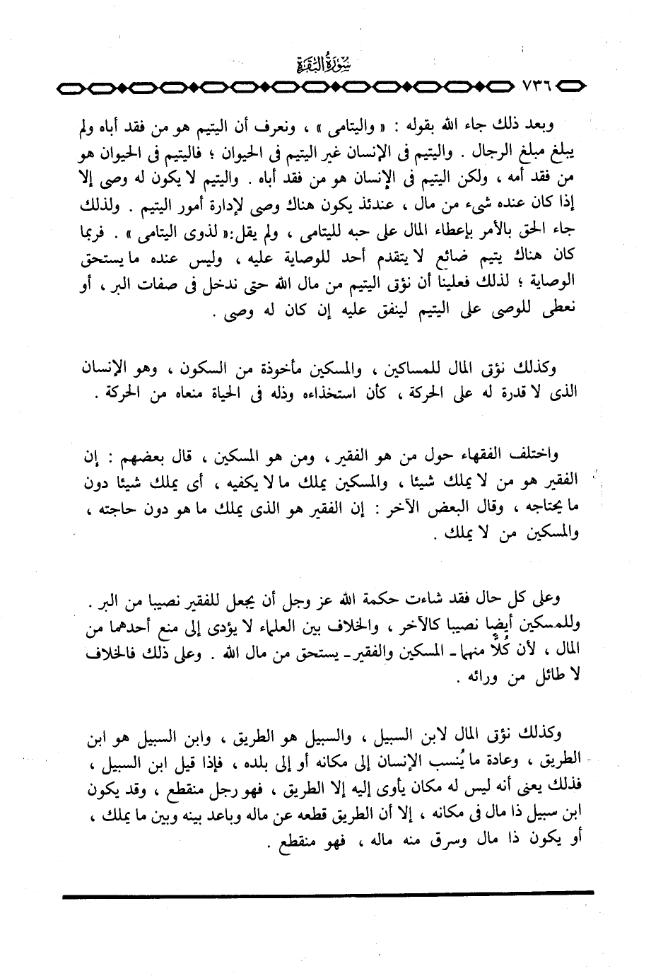 وعلى كل حال فقد شاءت حكمة الله عَزَّ وَجَلَّ أن يجعل للفقير نصيبا من البر وللمسكين أيضا نصيبا كالآخر، والخلاف بين العلماء لا يؤدي إلى منع أحدهما من المال، لأن كلا منهما المسكين والفقير يستحق من مال الله. وعلى ذلك فالخلاف لا طائل من ورائه.