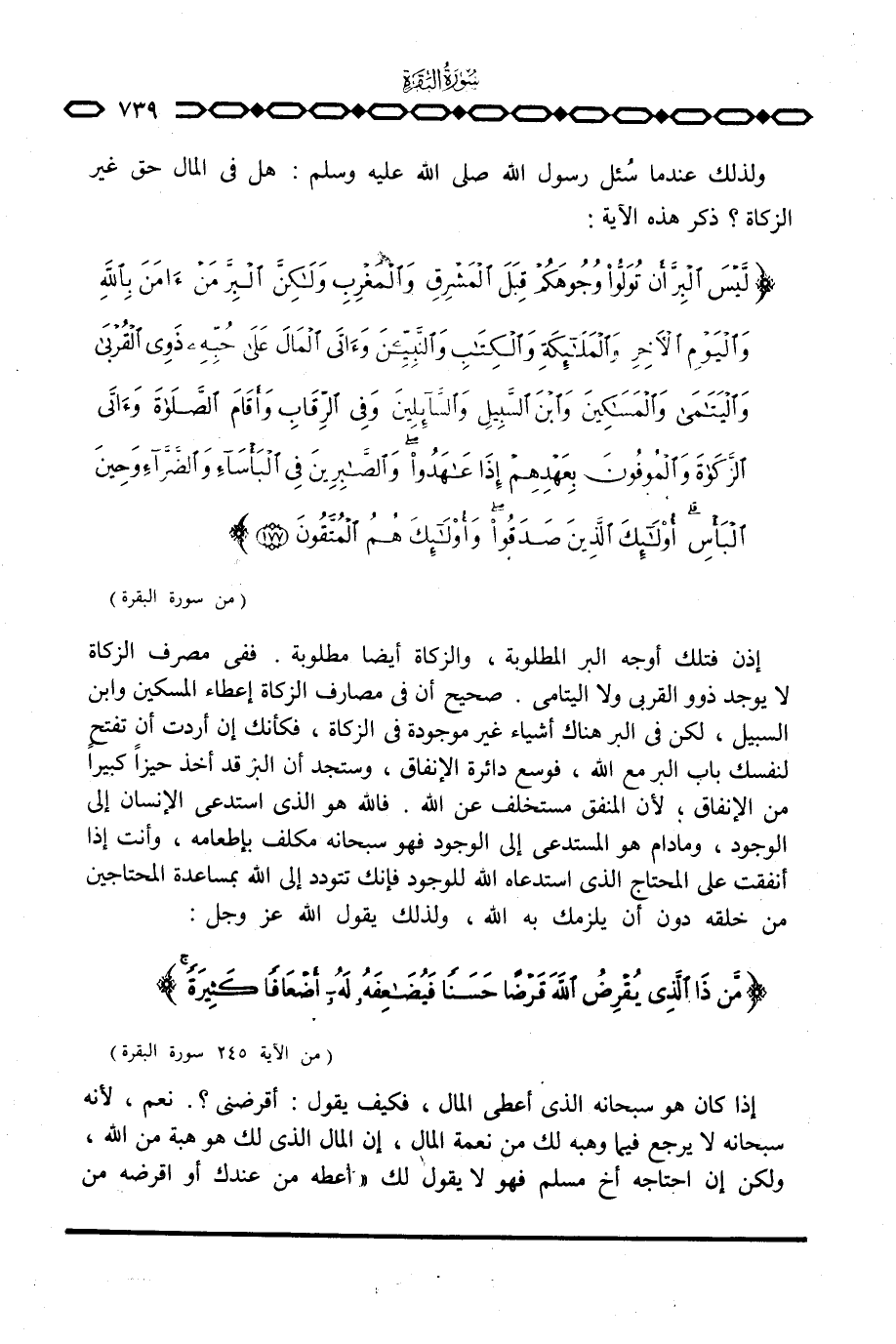 ولذلك عندما سُئل رسول الله صَلَّى اللَّهُ عَلَيْهِ وَسَلَّم َ: هل في المال حق غير الزكاة؟ ذكر هذه الآية: {لَّيْسَ البر أَن تُوَلُّواْ وُجُوهَكُمْ قِبَلَ المشرق والمغرب ولكن البر مَنْ آمَنَ بالله واليوم الآخر والملائكة والكتاب والنبيين وَآتَى المال على حُبِّهِ ذَوِي القربى واليتامى والمساكين وابن السبيل والسآئلين وَفِي الرقاب وَأَقَامَ الصلاة وَآتَى الزكاة والموفون بِعَهْدِهِمْ إِذَا عَاهَدُواْ والصابرين فِي البأسآء والضراء وَحِينَ البأس أولئك الذين صَدَقُواْ وأولئك هُمُ المتقون} [البقرة: 177]