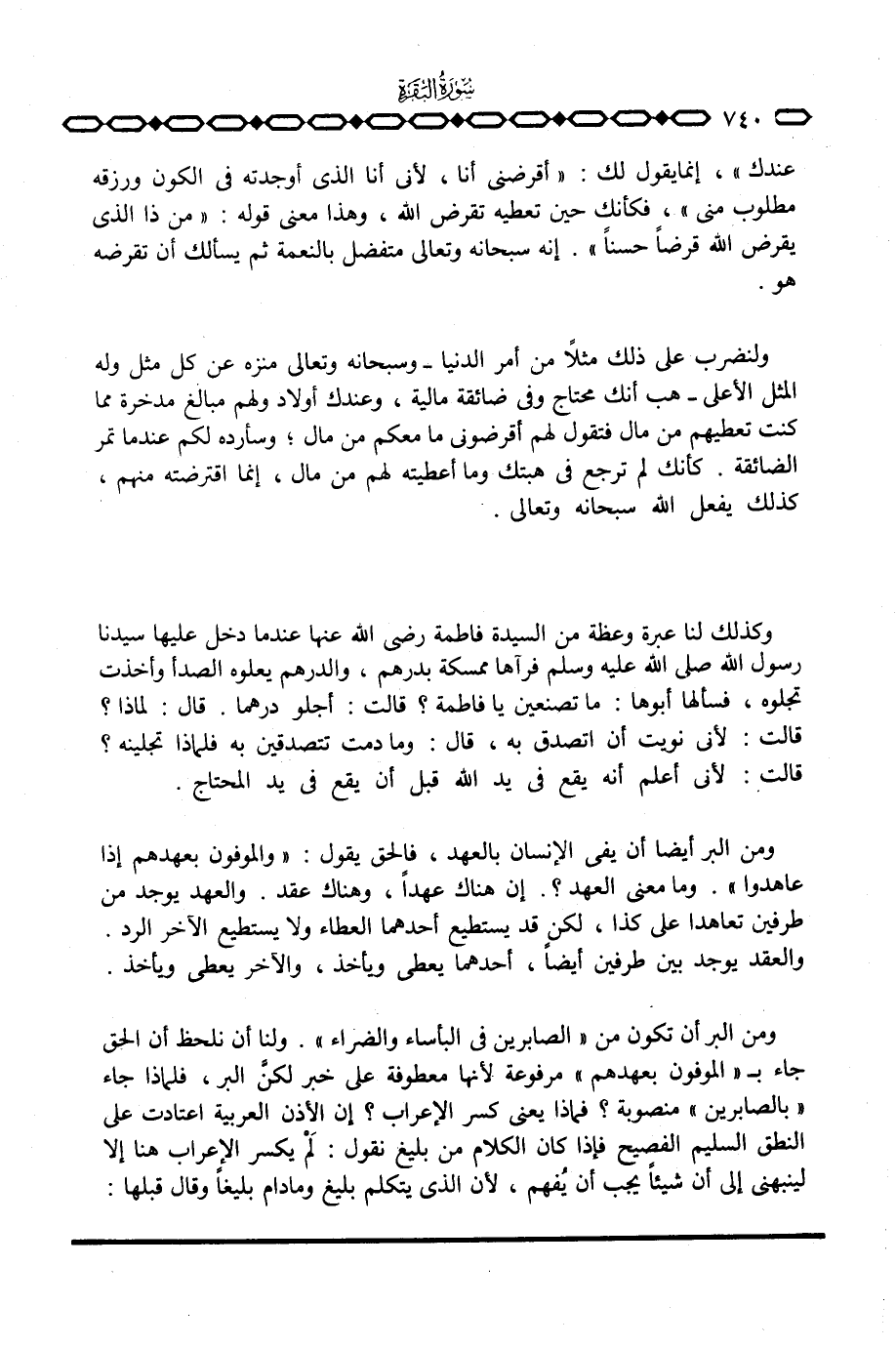 عندك» ، إنما يقول لك: «أقرضني أنا، لأني أنا الذي أوجدته في الكون ورزقه مطلوب مني» ، فكأنك حين تعطيه تقرض الله، وهذا معنى قوله: {مَّن ذَا الذي يُقْرِضُ الله قَرْضاً حَسَناً} . إنه سبحانه وتعالى متفضل بالنعمة ثم يسألك أن تقرضه هو.