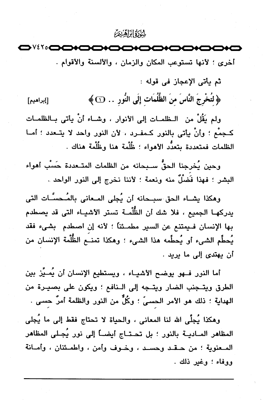 ولم يَقُلْ من الظلمات إلى الأنوار، وشاء أنْ يأتي بالظلمات كجمْع؛ وأنْ يأتي بالنور كالمفرد، لأن النور واحد لا يتعدد؛ أما الظلمات فمتعددة بتعدُّد الأهواء؛ ظُلْمة هنا وظُلْمة هناك.