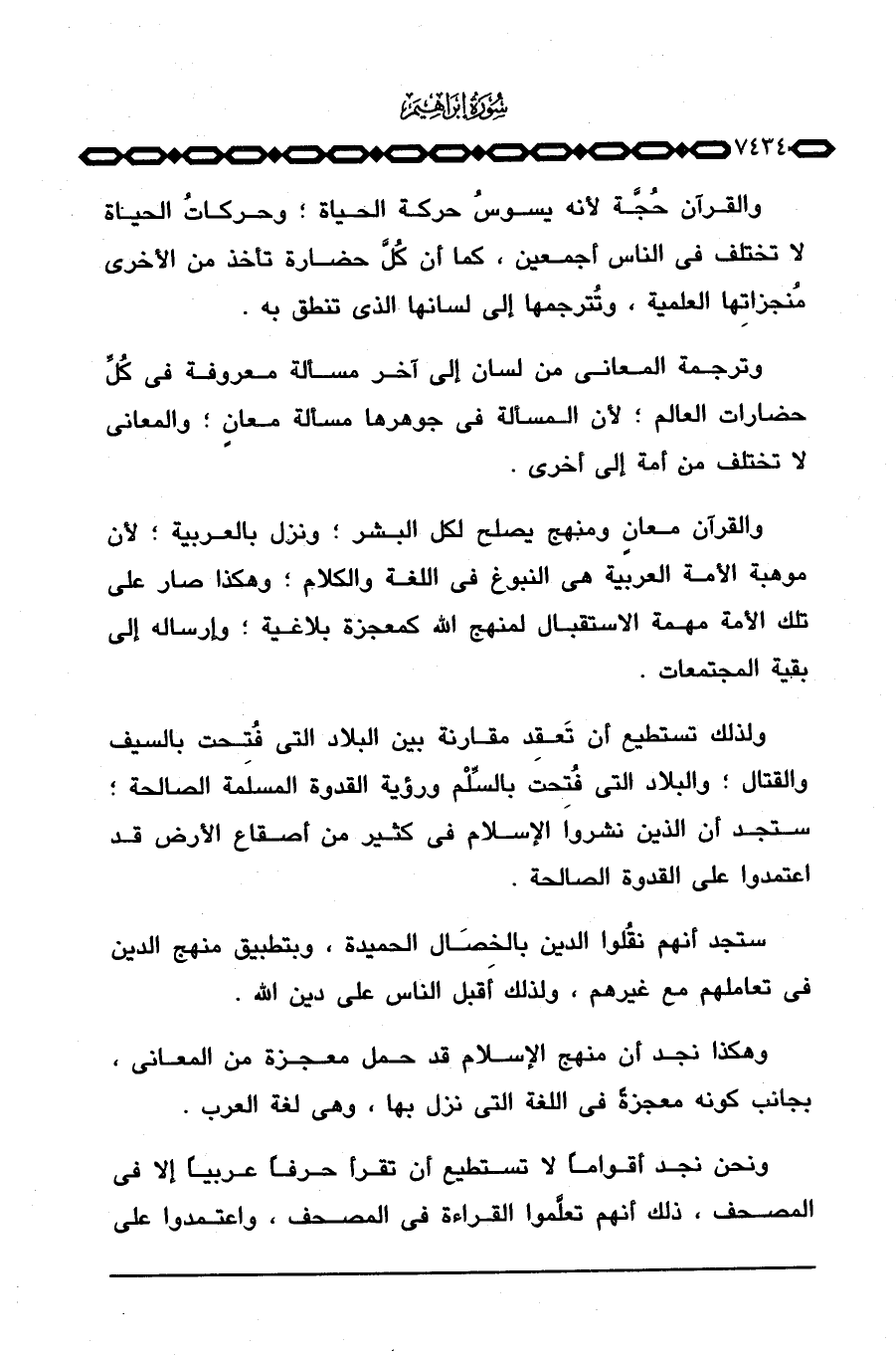 والقرآن حُجَّة لأنه يسوسُ حركة الحياة؛ وحركاتُ الحياة لا تختلف في الناس أجمعين، كما أن كُلَّ حضارة تأخذ من الأخرى مُنجزاتِها العلمية، وتُترجمها إلى لسانها الذي تنطق به.