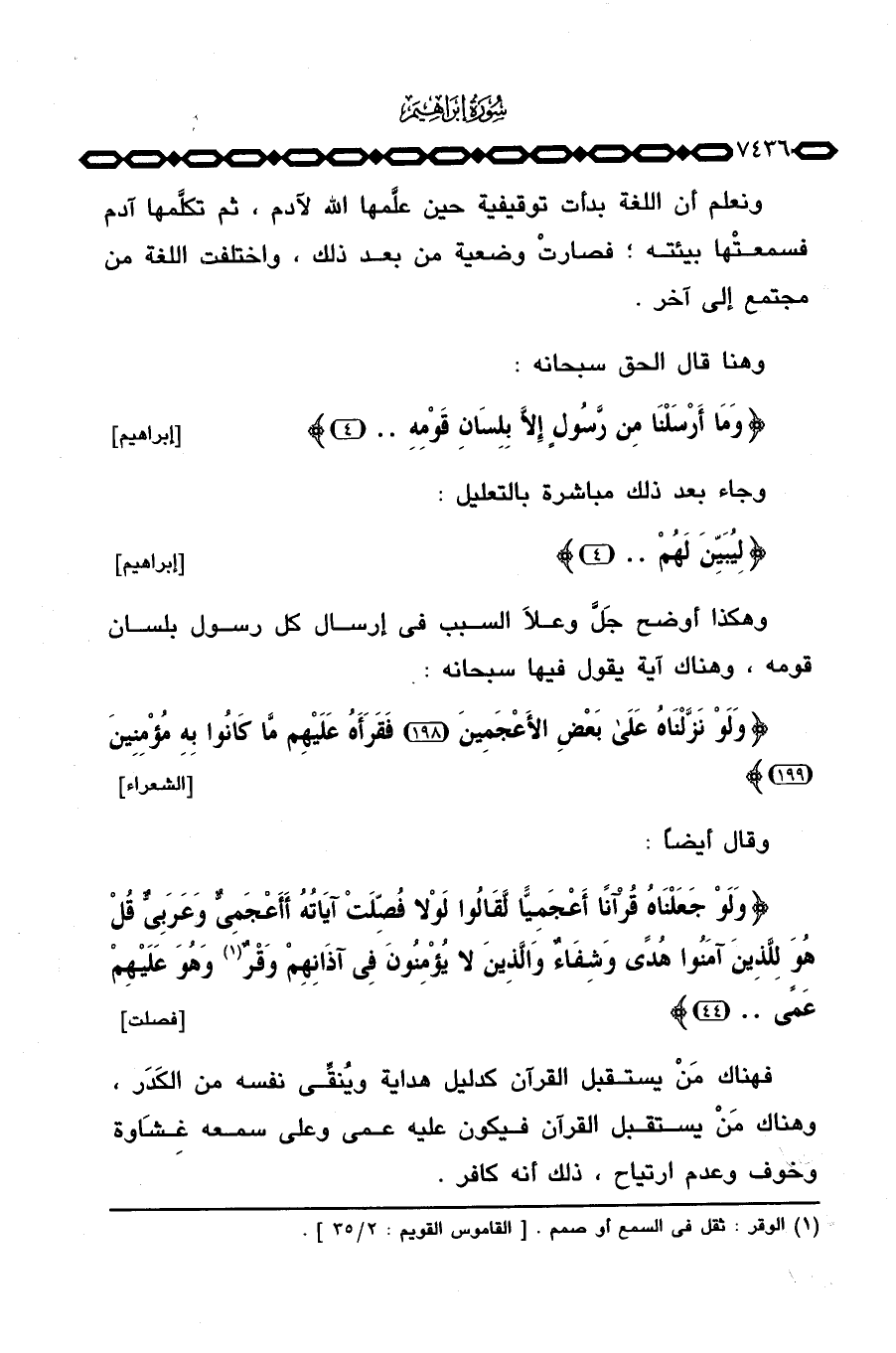 وهكذا أوضح جَلَّ وعلاَ السبب في إرسال كل رسول بلسان قومه، وهناك آية يقول فيها سبحانه: {وَلَوْ نَزَّلْنَاهُ على بَعْضِ الأعجمين فَقَرَأَهُ عَلَيْهِم مَّا كَانُوا بِهِ مُؤْمِنِينَ} [الشعراء: 198 - 199] .