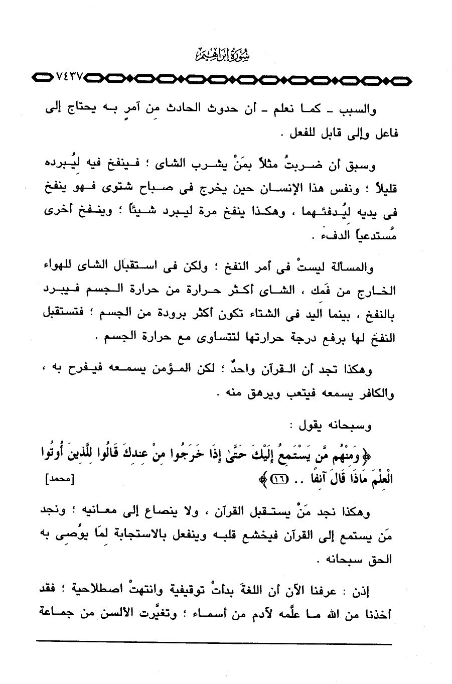 إذن: عرفنا الآن أن اللغة بدأتْ توقيفية وانتهتْ اصطلاحية؛ فقد أخذنا من الله ما علَّمه لآدم من أسماء؛ وتغيَّرت الألسن من جماعة