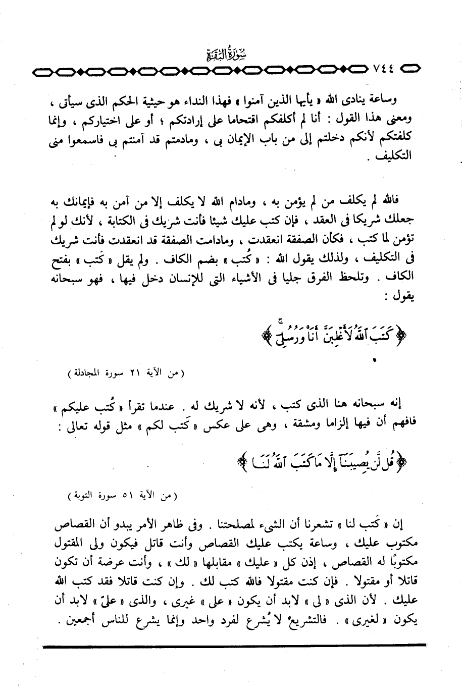 إنه سبحانه هنا الذي كتب، لأنه لا شريك له. عندما تقرأ {كُتِبَ عَلَيْكُمُ} فافهم أن فيها إلزاما ومشقة، وهي على عكس «كتب لكم» مثل قوله تعالى: {قُل لَّن يُصِيبَنَآ إِلاَّ مَا كَتَبَ الله لَنَا} [التوبة: 51]