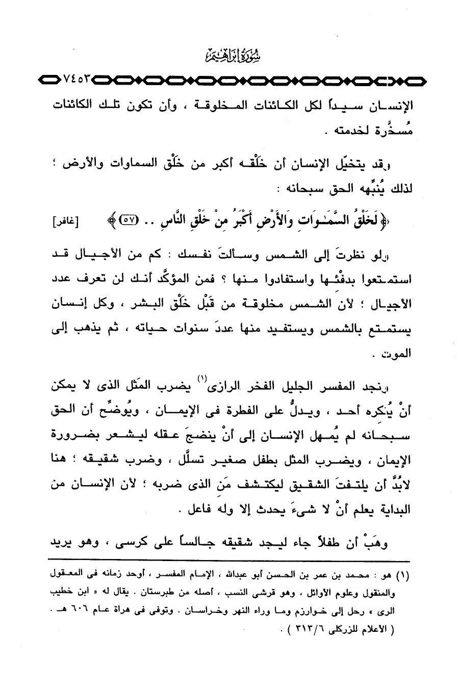 ونجد المفسر الجليل الفخر الرازي يضرب المَثل الذي لا يمكن أن يُنكِره أحد، ويدلُّ على الفطرة في الإيمان، ويُوضِّح أن الحق سبحانه لم يُمهل الإنسان إلى أنْ ينضجَ عقله ليشعر بضرورة الإيمان، ويضرب المثل بطفل صغير تسلَّل، وضرب شقيقه؛ هنا لا بُدَّ أن يلتفتَ الشقيق ليكتشف مَنِ الذي ضربه؛ لأن الإنسان من البداية يعلم أنْ لا شيءَ يحدث إلا وله فاعل.