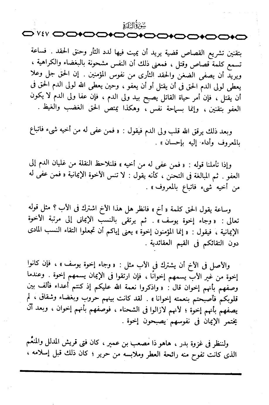 وإذا تأملنا قوله: {فَمَنْ عُفِيَ لَهُ مِنْ أَخِيهِ} فلنلاحظ النقلة من غليان الدم إلى العفو. ثم المبالغة في التحنن، كأنه يقول: لا تنس الأخوة الإيمانية {فَمَنْ عُفِيَ لَهُ مِنْ أَخِيهِ شَيْءٌ فاتباع بالمعروف} .