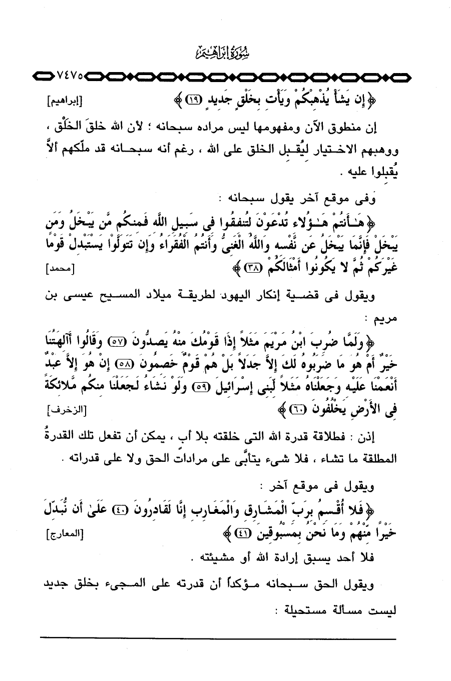 ويقول في قضية إنكار اليهود لطريقة ميلاد المسيح عيسى بن مريم: {وَلَمَّا ضُرِبَ ابن مَرْيَمَ مَثَلاً إِذَا قَوْمُكَ مِنْهُ يَصِدُّونَ وقالوا أَآلِهَتُنَا خَيْرٌ أَمْ هُوَ مَا ضَرَبُوهُ لَكَ إِلاَّ جَدَلاً بَلْ هُمْ قَوْمٌ خَصِمُونَ إِنْ هُوَ إِلاَّ عَبْدٌ أَنْعَمْنَا عَلَيْهِ وَجَعَلْنَاهُ مَثَلاً لبني إِسْرَائِيلَ وَلَوْ نَشَآءُ لَجَعَلْنَا مِنكُمْ مَّلاَئِكَةً فِي الأرض يَخْلُفُونَ} [الزخرف: 57 - 60] .