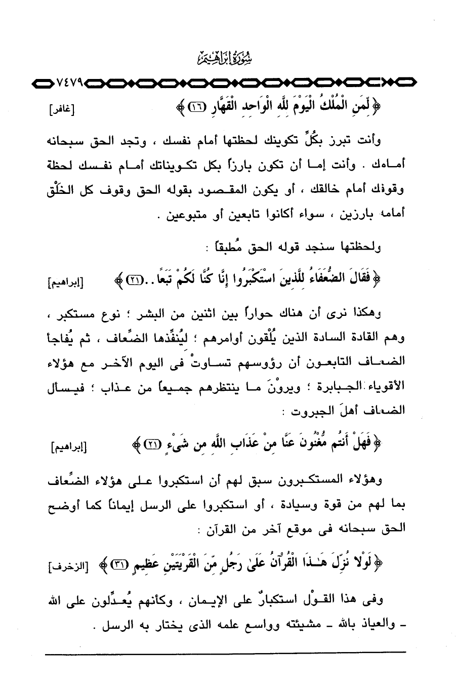وهكذا نرى أن هناك حواراً بين اثنين من البشر؛ نوع مستكبر، وهم القادة السادة الذين يُلقون أوامرهم؛ لِيُنفِّذها الضِّعاف، ثم يُفاجأ الضعاف التابعون أن رؤوسهم تساوتْ في اليوم الآخر مع هؤلاء الأقوياءالجبابرة؛ ويروْنَ ما ينتظرهم جميعاً من عذاب؛ فيسأل الضعاف أهلَ الجبروت: