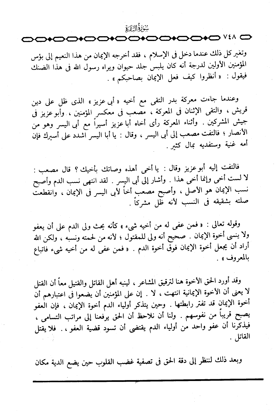 وقد أورد الحق الأخوة هنا لترقيق المشاعر، لينبه أهل القاتل والقتيل معاً أن القتل لا يعني أن الأخوة الإيمانية انتهت، لا. إن على المؤمنين أن يضعوا في اعتبارهم أن أخوة الإيمان قد تفتر رابطتها. وحين يتذكر أولياء الدم أخوة الإيمان، فإن العفو يصبح قريباً من نفوسهم. ولنا أن نلاحظ أن الحق يرفعنا إلى مراتب التسامي، فيذكرنا أن عفو واحد من أولياء الدم يقتضي أن تسود قضية العفو، فلا يقتل القاتل.