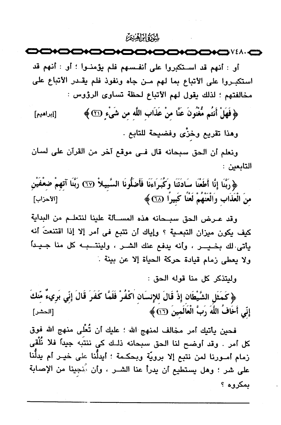 ونعلم أن الحق سبحانه قال في موقع آخر من القرآن على لسان التابعين: {رَبَّنَآ إِنَّآ أَطَعْنَا سَادَتَنَا وَكُبَرَآءَنَا فَأَضَلُّونَا السبيلا رَبَّنَآ آتِهِمْ ضِعْفَيْنِ مِنَ العذاب والعنهم لَعْناً كَبِيراً} [الأحزاب: 67 - 68] .