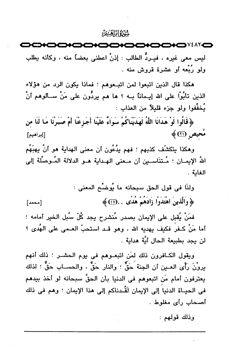ويقول الكافرون ذلك لِمَن اتبعوهم في يوم الحشر؛ ذلك أنهم يروْنَ رَأْي العين أن الجنةَ حَقٌّ؛ والنار حَقٌّ، والحساب حَقٌّ؛ لذلك يعترفون أمام مَنِ اتبعوهم في الدنيا بأن الحقَّ سبحانه لو أخذ بيدهم في الحياة الدنيا إلى الإيمان لَقْدناكم إلى هذا الإيمان؛ وهم في ذلك أصحاب رأي مغلوط.