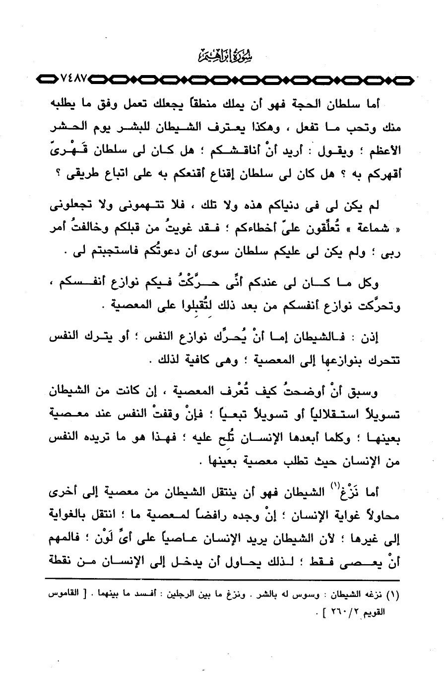 أما سلطان الحجة فهو أن يملك منطقاً يجعلك تعمل وفق ما يطلبه منك وتحب ما تفعل، وهكذا يعترف الشيطان للبشر يوم الحشر الأعظم؛ ويقول: أريد أنْ أناقشكم؛ هل كان لي سلطان قَهْريّ أقهركم به؟ هل كان لي سلطان إقناع أقعنكم به على اتباع طريقي؟
