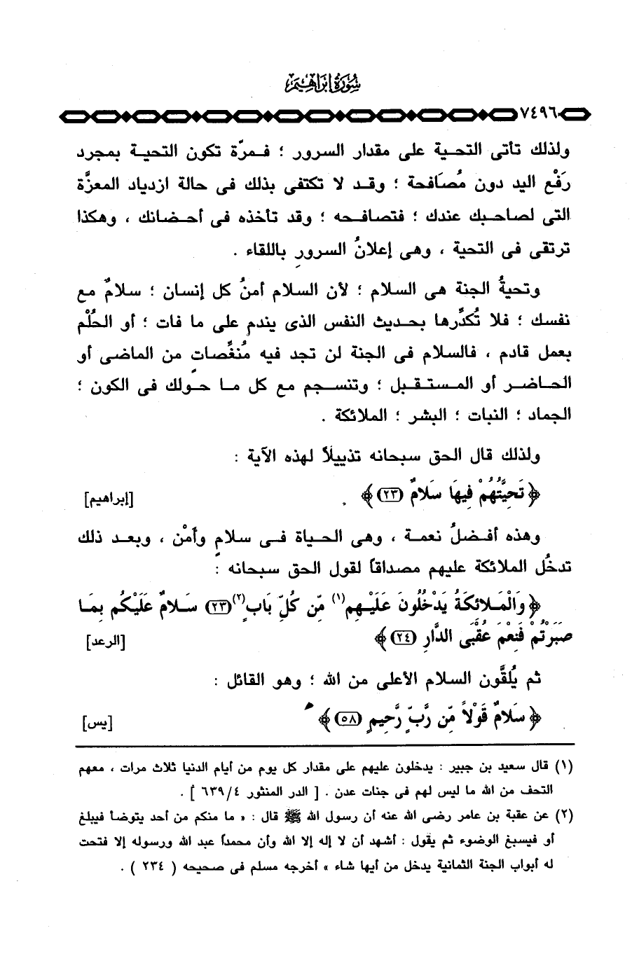 وتحية الجنة هي السلام لأن السلام أمنُ كل إنسان؛ سلامٌ مع نفسك؛ فلا تُكدِّرها بحديث النفس الذي يندم على ما فات؛ أو الحُلْم بعمل قادم، فالسلام في الجنة لن تجد فيه مُنغِّصاتٍ من الماضي أو الحاضر أو المستقبل؛ وتنسجم مع كل ما حولك في الكون؛ الجماد؛ النبات؛ البشر؛ الملائكة.