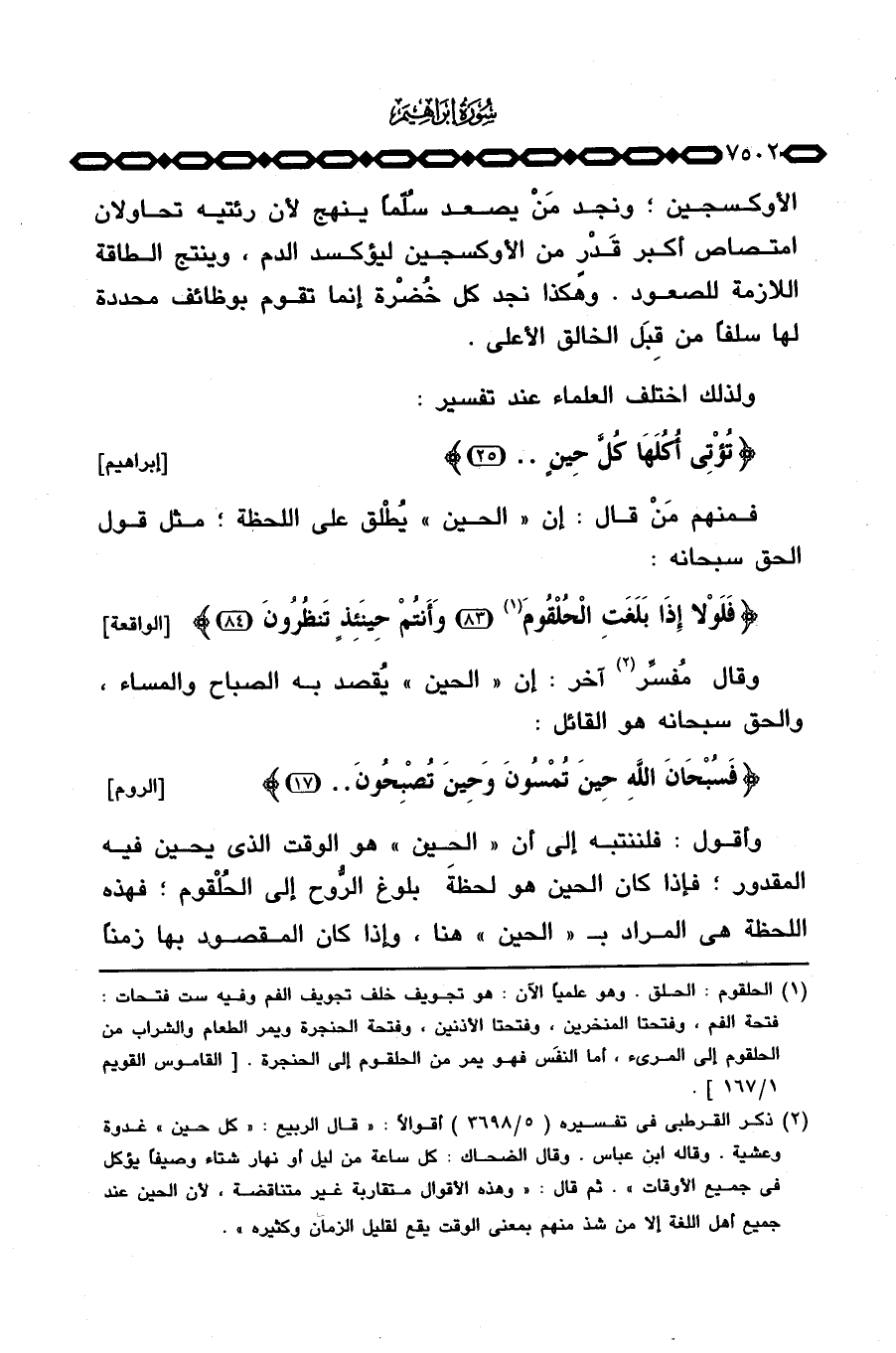 وقال مُفسِّر آخر: إن «الحين» يُقصد به الصباح والمساء، والحق سبحانه هو القائل: {فَسُبْحَانَ الله حِينَ تُمْسُونَ وَحِينَ تُصْبِحُونَ} [الروم: 17] .