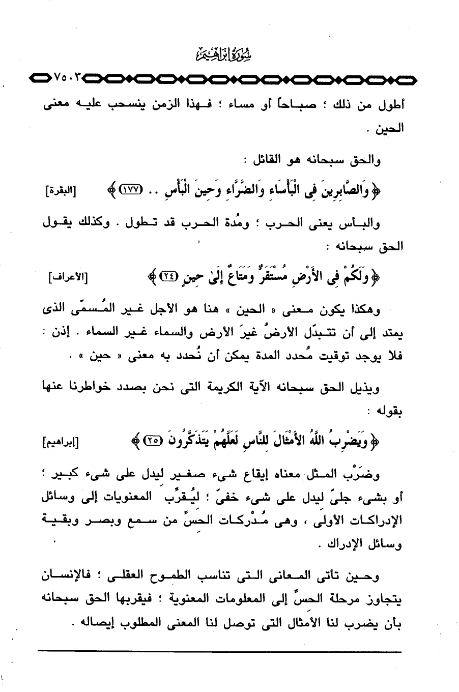 وهكذا يكون معنى «الحين» هنا هو الأجل غير المُسمّى الذي يمتد إلى أن تتبدّل الأرضُ غيرَ الأرض والسماء غير السماء. إذن: فلا يوجد توقيت مُحدد المدة يمكن أن نُحدد به معنى «حين» .