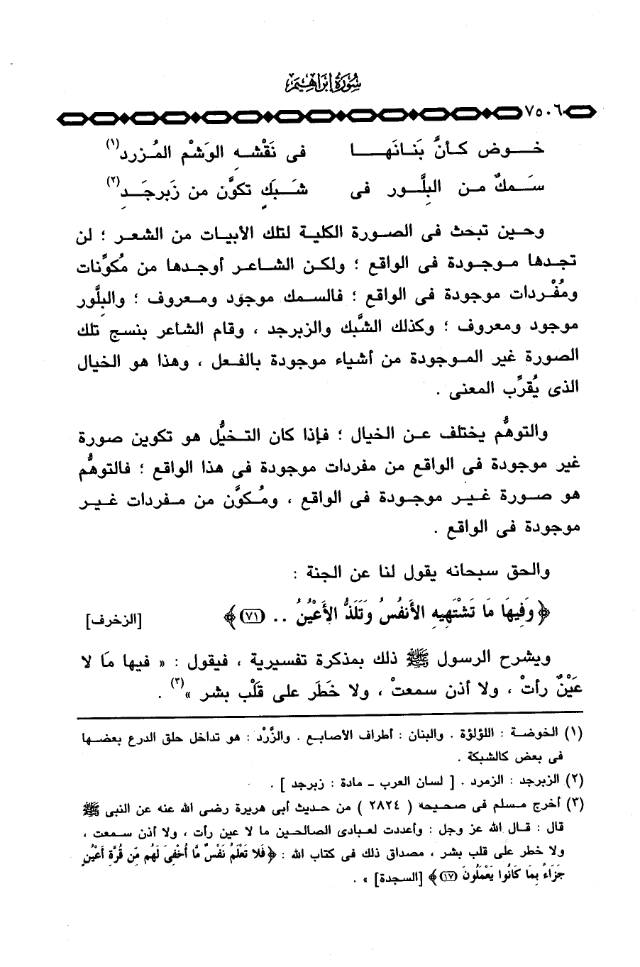 وحين تبحث في الصورة الكلية لتلك الأبيات من الشعر؛ لن تجدها موجودة في الواقع؛ ولكن الشاعر أوجدها من مُكوِّنات ومُفْردات موجودة في الواقع؛ فالسمك موجود ومعروف؛ والبِلَّور موجود ومعروف؛ وكذلك الشَّبك والزبرجد، وقام الشاعر بنسج تلك الصورة غير الموجودة من أشياء موجودة بالفعل، وهذا هو الخيال الذي يُقرِّب المعنى.