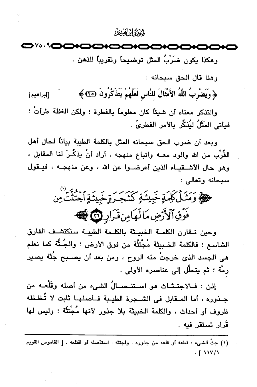 وحين نقارن الكلمة الخبيثة بالكلمة الطيبة سنكتشف الفارق الشاسع؛ فالكلمة الخبيثة مُجْتثَّة من فوق الأرض؛ والجُثَّة كما نعلم هي الجسد الذي خرجتْ منه الروح، ومن بعد أن يصبح جُثة يصير رِمَّة؛ ثم يتحلَّل إلى عناصره الأولى.