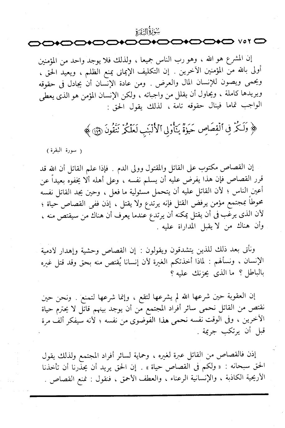 إن العقوبة حين شرعها الله لم يشرعها لتقع، وإنما شرعها لتمنع. ونحن حين نقتص من القاتل نحمي سائر أفراد المجتمع من أن يوجد بينهم قاتل لا يحترم حياة الآخرين، وفي الوقت نفسه نحمي هذا الفوضوي من نفسه؛ لأنه سيفكر ألف مرة قبل أن يرتكب جريمة.